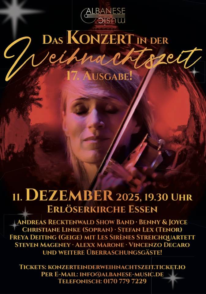 … wird wieder musikalisch: mit dem diesjährigen Konzert in der Weihnachtszeit von Albanese Music bereiten wir uns alljährlich auf die schönste Zeit des Jahres vor. Und das bereits zum 17. Mal. Immer mit wechselnden Gästen, aber immer mit BENNY & JOYCE. Dieses Jahr findet das Konzert in der Weihnachtszeit am 11.12.2025 wieder in der Erlöserkirche in Essen statt. Tickets gibt es unter unter diesem Link bei tickets.io